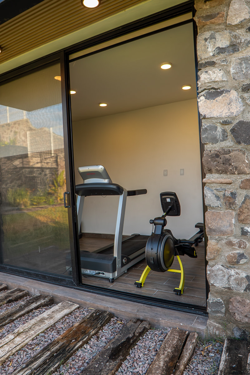 Habitación adaptada como gimnasio, ubicada junto al jardín, con luz natural y ventilación abundante.