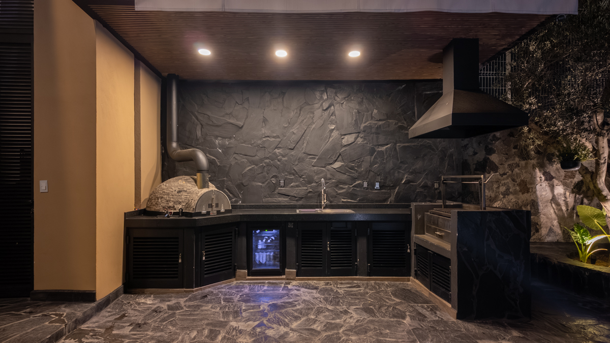 Cuenta con horno de leña artesanal para pizzas o pan casero, parrilla de carbón para asados, frigobar para mantener las bebidas frías y todos los utensilios necesarios para disfrutar sin prisa.